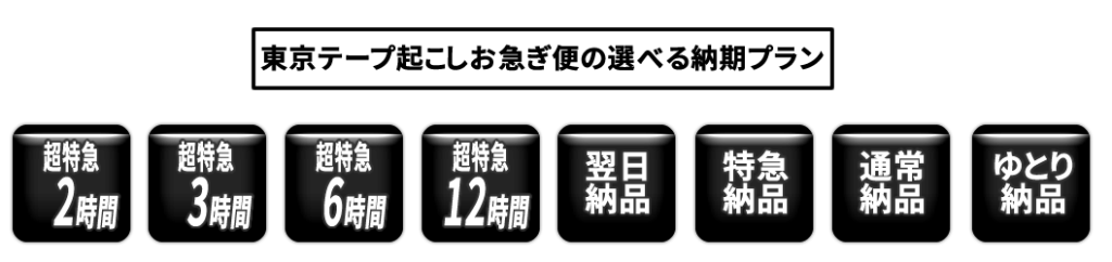 24時間365日 超特急最短2時間後の当日納品対応可能 こんなお悩みありませんか? ・明日の会議の資料として使いたい。短納期で書き起こししてほしい・土日・祝日 18時以降にテープ起こしの依頼をしたい・英語もしくは英語以外の文章起こし・反訳をお願いできますか。・他社へ依頼したけど断られた。録音状態が悪い音声でも起こせますか?・アナログテープの状態でもテキスト化可能ですか?・録音時間がかなり長い場合でも対応可能ですか・音声ファイルや個人情報のセキュリティーは大丈夫ですか?